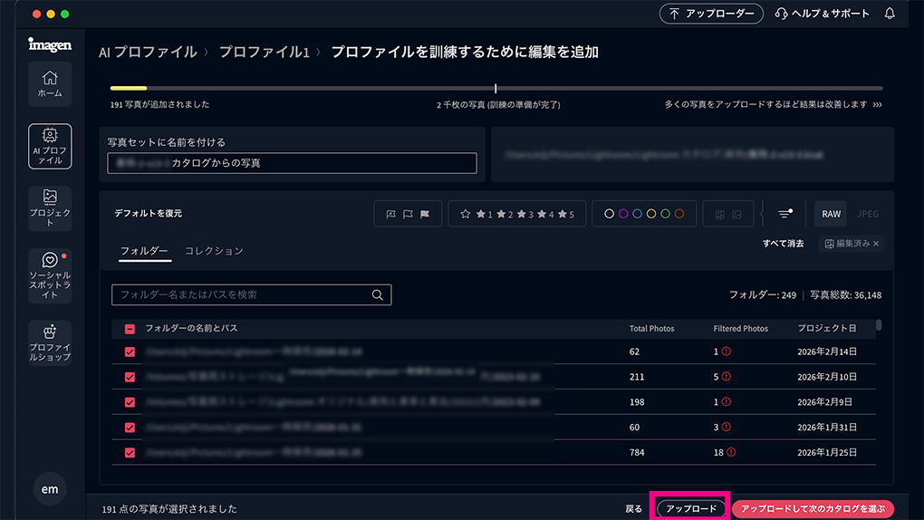 パーソナル AI プロファイルの作成に必要な写真データ2000枚に達していない場合、引き続き同じ手順で写真をアップロードします。