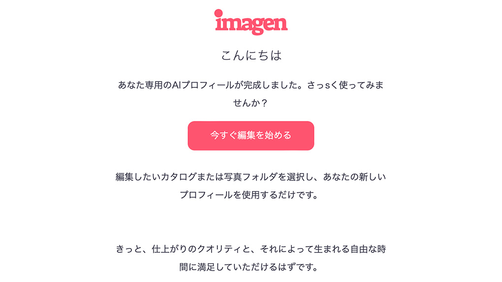 2000枚以上の写真のデータをアップロードし、AI学習が終了するとImagenからパーソナル AI プロファイルの作成が完了したメールが届き、一括編集に使用できるようになります。