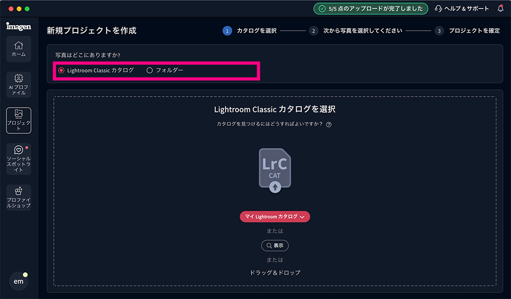 カタログから読み込む対象の写真を指定し、アップロードをクリック。