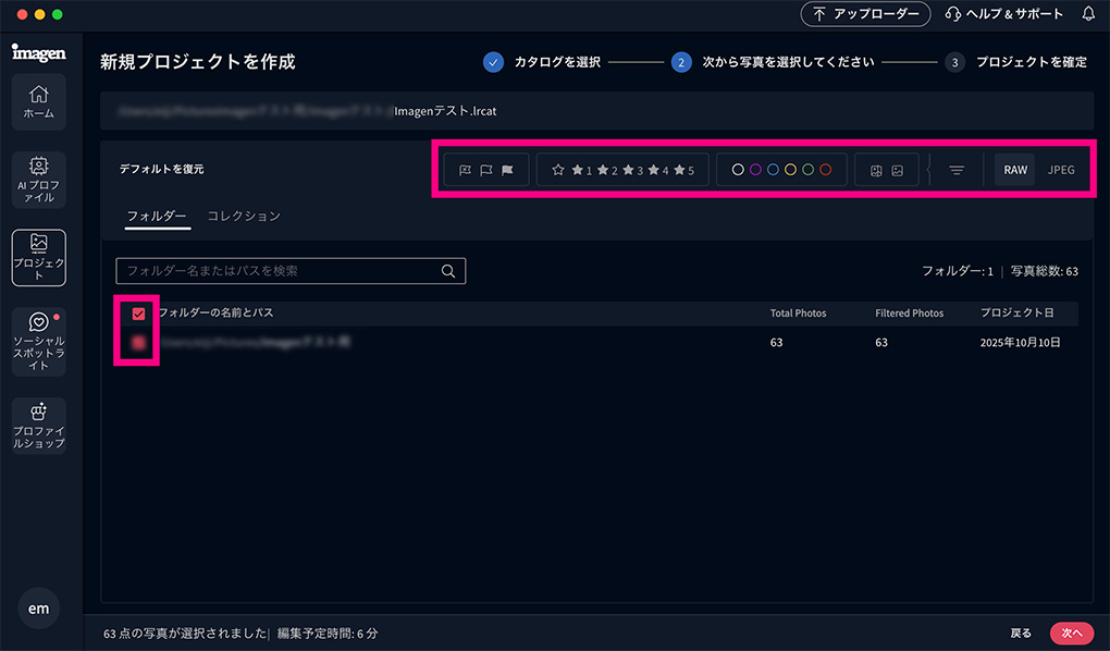 写真の選択はフォルダにチェックを入れて指定する方法とフィルタリングがあります。
