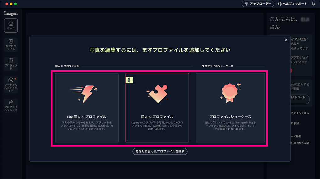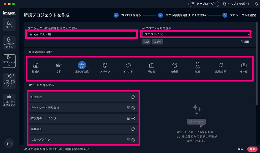 Imagenで写真の一括編集を行うには3種類のAIプロファイルのいずれかを使用します。