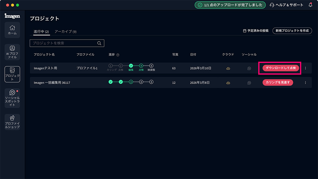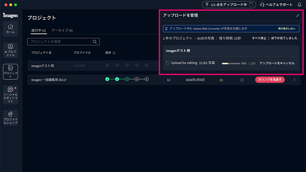 Lightroomでの微調整が済んだらImagenのプロジェクトで編集の最終版をアップロードをクリックすることでパーソナルAIプロファイルの最適化を行うことが可能です。