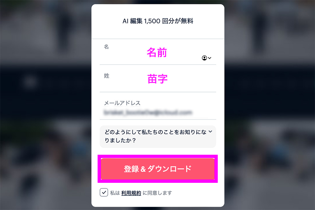 名前と名字とメールアドレスを入力し、登録&ダウンロードをクリックします。