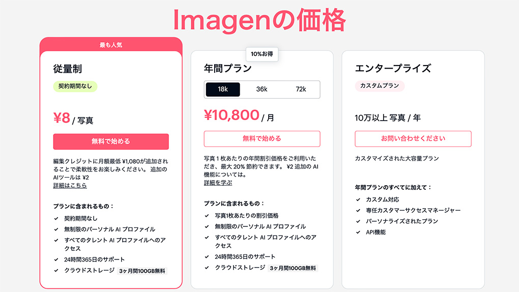 Imagenの価格設定は従量制と年間プランとエンタープライズの3種類があるのでそれぞれの違いを解説します。