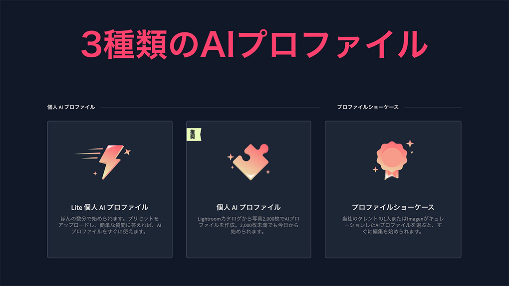- タレント AIプロファイル:世界のプロフォトグラファーもしくはImagen AIチームの編集スタイルを学習した編集スタイルを元に写真を一括編集する